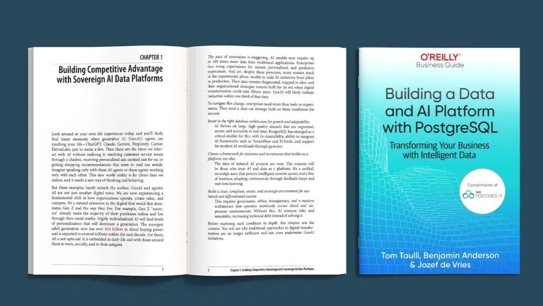 本篇介绍《构建基于PostgreSQL的数据与AI平台》这本书。O'Reilly首部PostgreSQL AI平台权威指南发布!告别“试点陷阱”,从构想到生产。EDB联手O'Reilly推出行业首部实战蓝图,助您构建拥有数据主权的AI平台。在人工智能(AI)狂飙突进的今天,一个扎心的现实摆在很多企业面前:虽然 95% 的企业计划在未来三年内构建自己的数据和AI平台,但目前只有 13%的企业能够成功实现规模化落地。全球领先的主权AI和数据公司EnterpriseDB (EDB)给出了答案:问题不在于模型,而在于平台设计。近日,EDB宣布发布行业首部相关著作——《构建基于PostgreSQL的数据与AI平台》(Building a Data and AI Platform with PostgreSQL)。这本书由权威技术出版商O’Reilly Media出版,为企业高管和架构师提供了一份将生成式AI(GenAI)和代理型AI(Agentic AI)从实验室带入生产环境的实战蓝图 。💡 为什么你需要这本书?