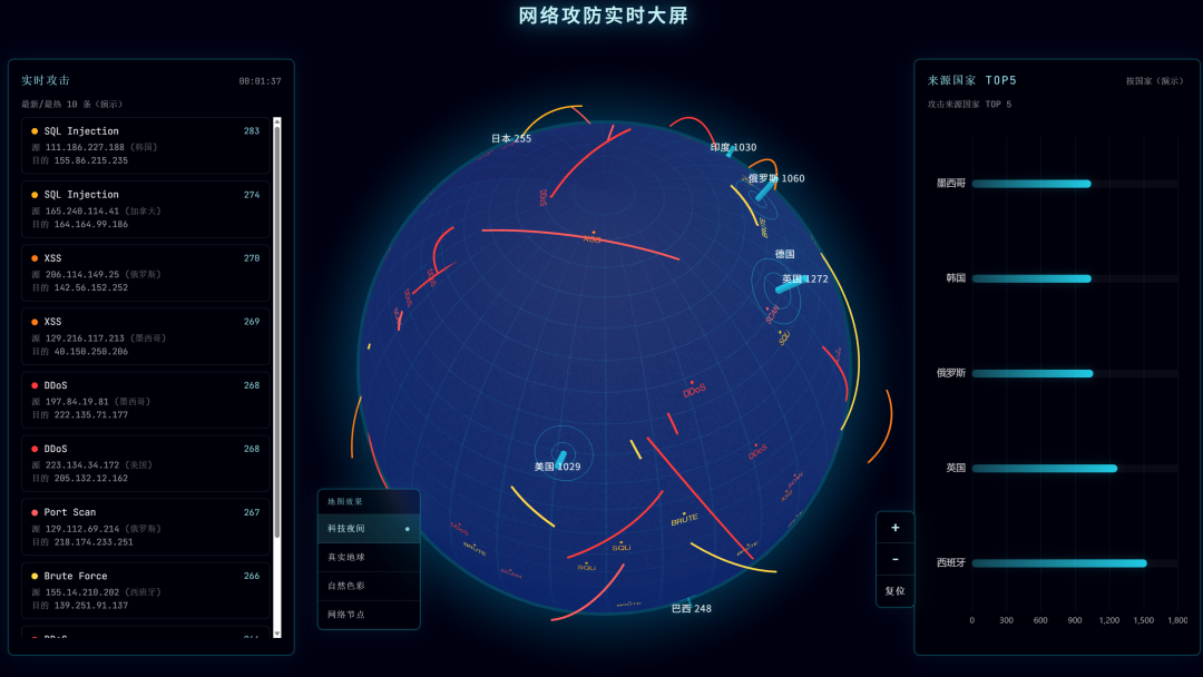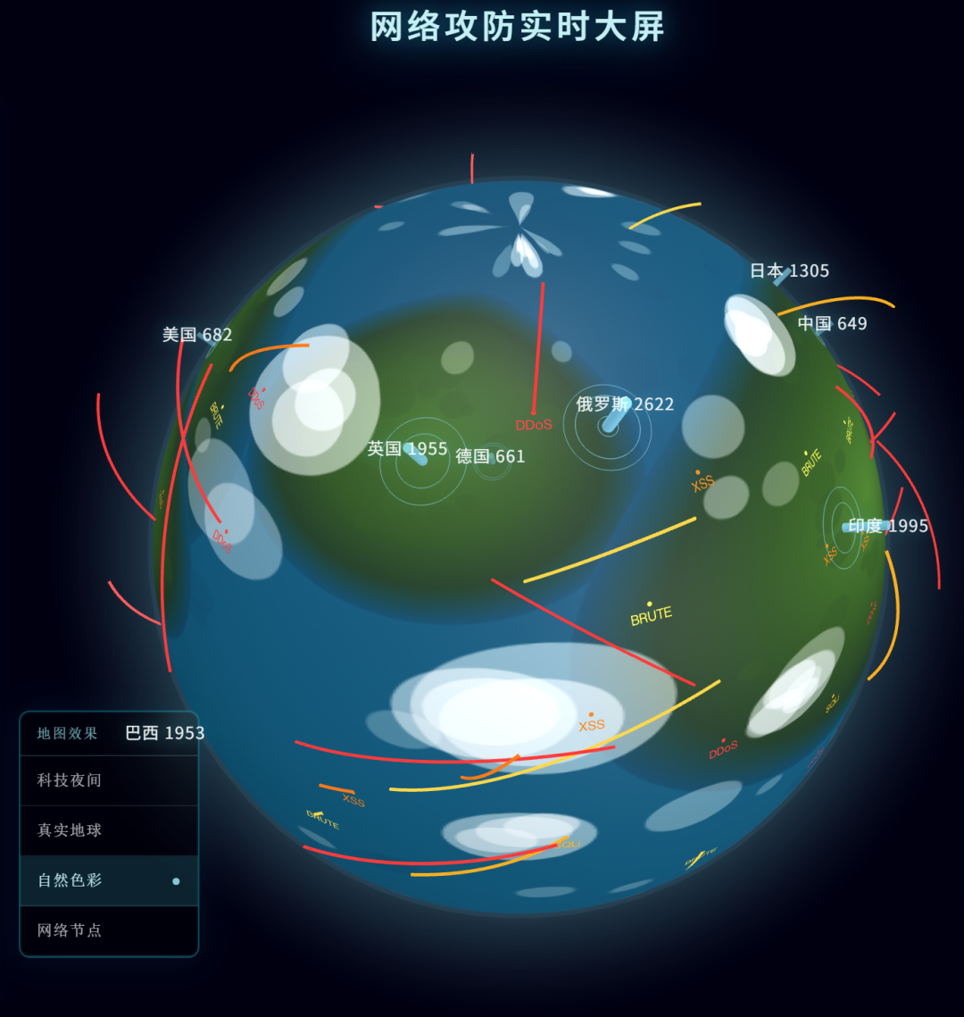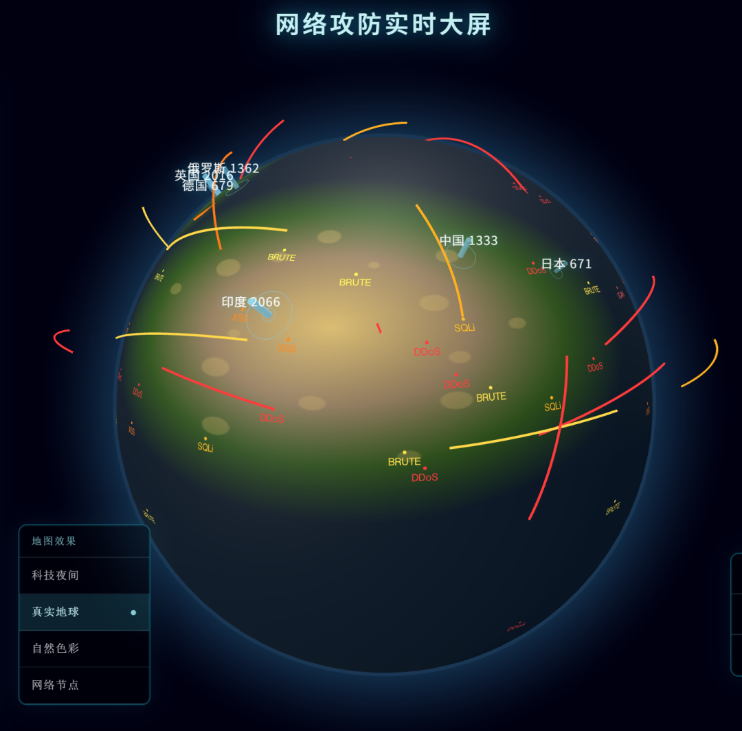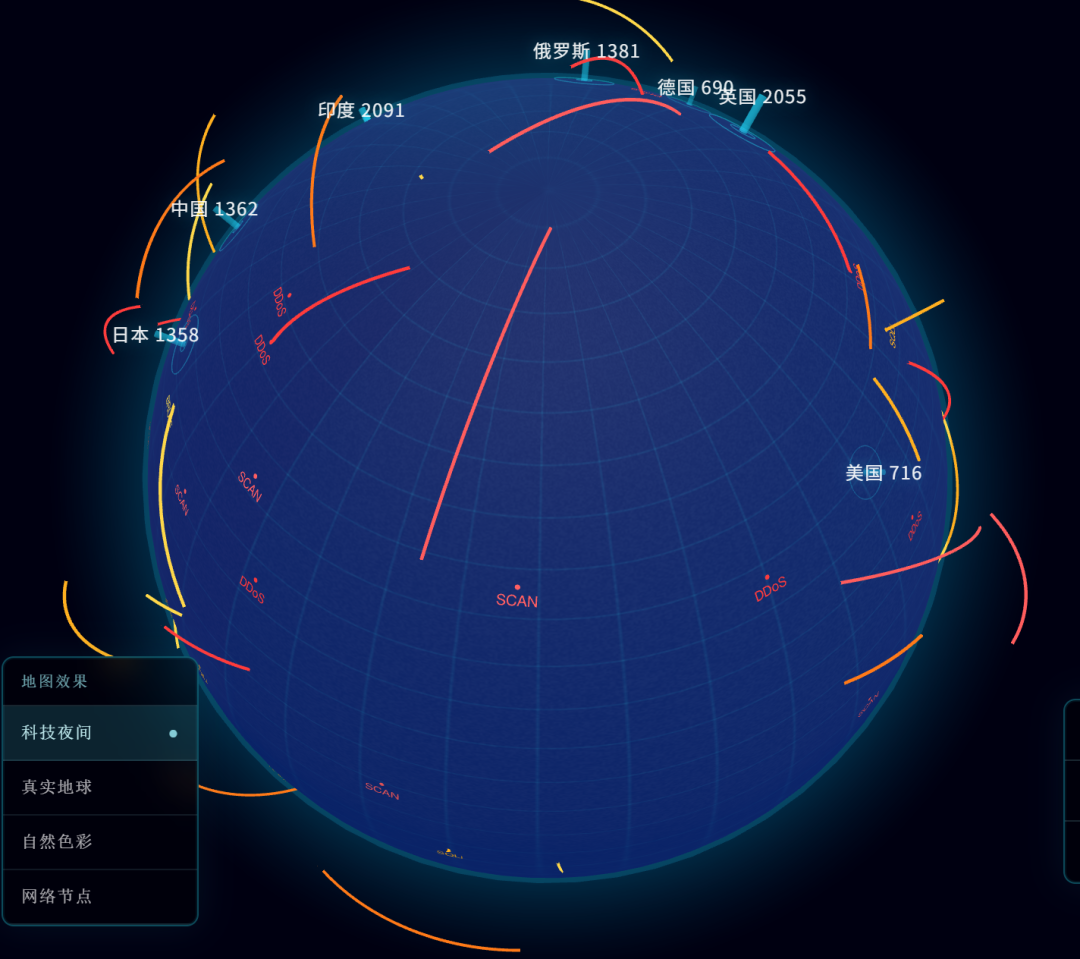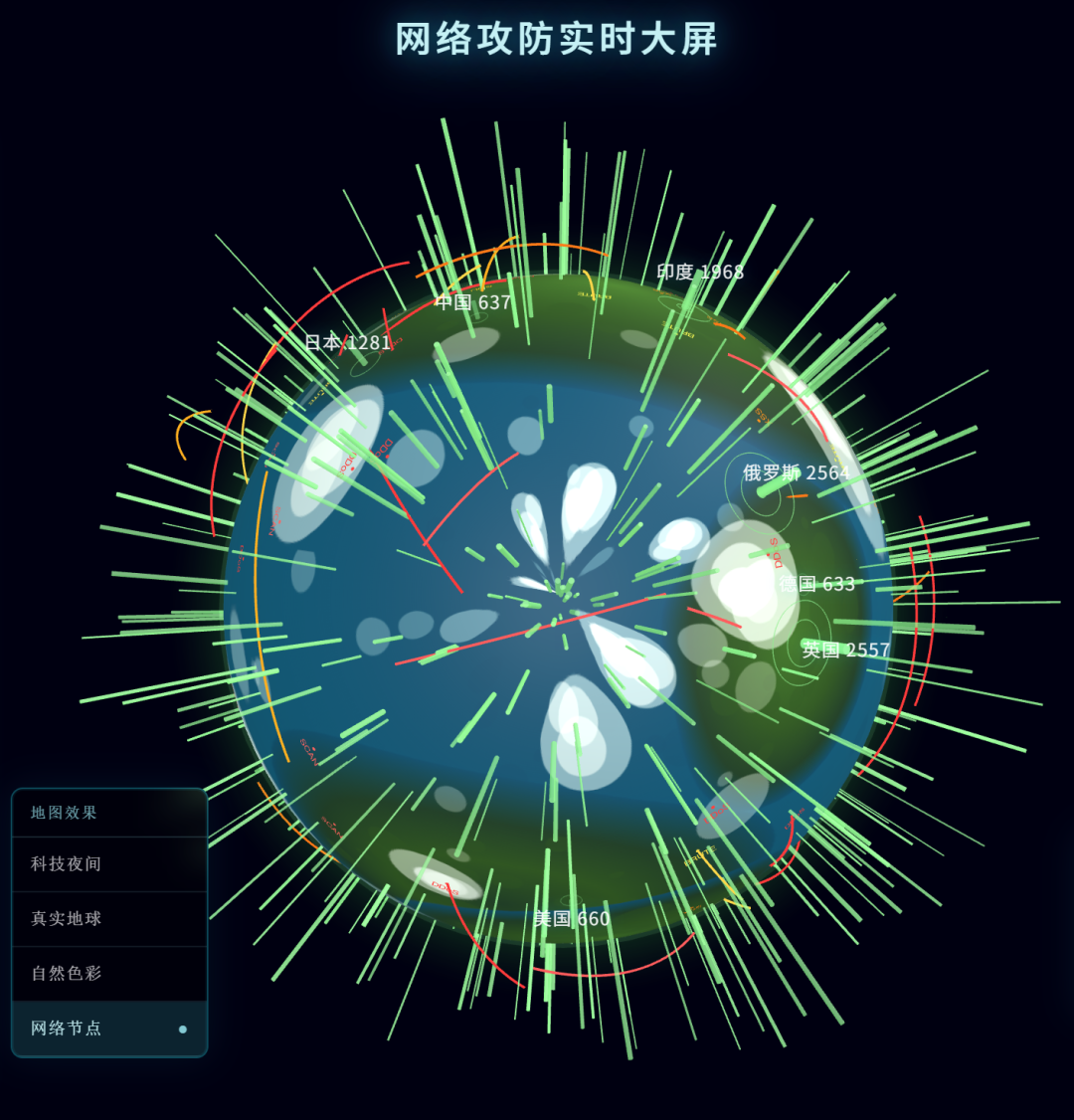 实时网络攻击地图,要能看到飞线在地球上穿梭 全球服务器热力图,要3D效果,要能拖拽旋转 电商实时交易流,要科幻感,要一眼抓住眼球
