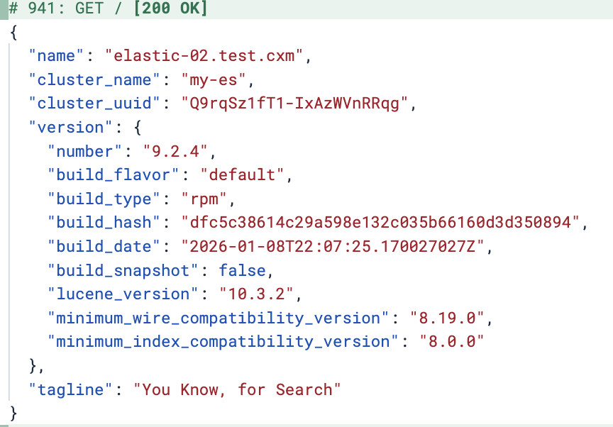 # 检查集群版本(应显示 9.2.4)curl -XGET "https://192.168.31.11:9200" -u elastic:<password> --cacert path/to/ca.crt | jq# 检查所有节点版本(应全部为 9.2.4)curl -XGET "https://192.168.31.11:9200/_cat/nodes?v&h=name,version,jdk" \-u elastic:<password> \--cacert path/to/ca.crt# 检查集群健康状态curl -XGET "https://192.168.31.11:9200/_cluster/health?pretty" \-u elastic:<password> \--cacert path/to/ca.crt# 检查分片状态curl -XGET "https://192.168.31.11:9200/_cat/shards?v&h=index,shard,prirep,state,node" \-u elastic:<password> \--cacert path/to/ca.crt | grep -v STARTED