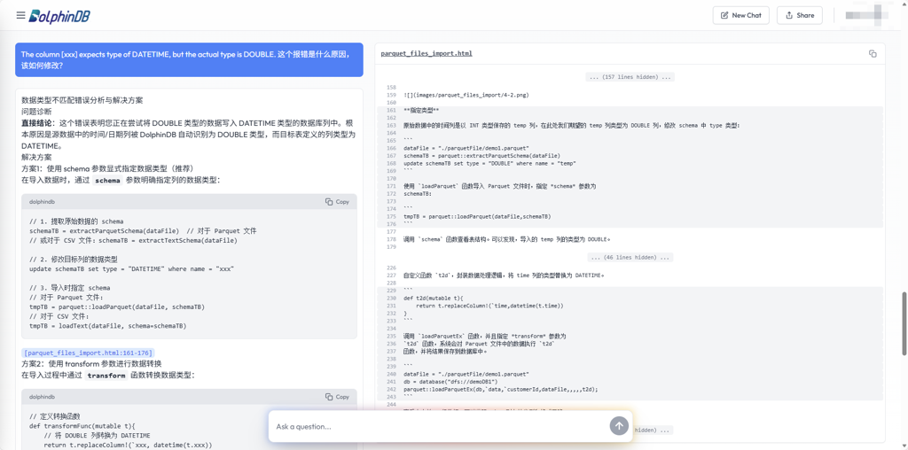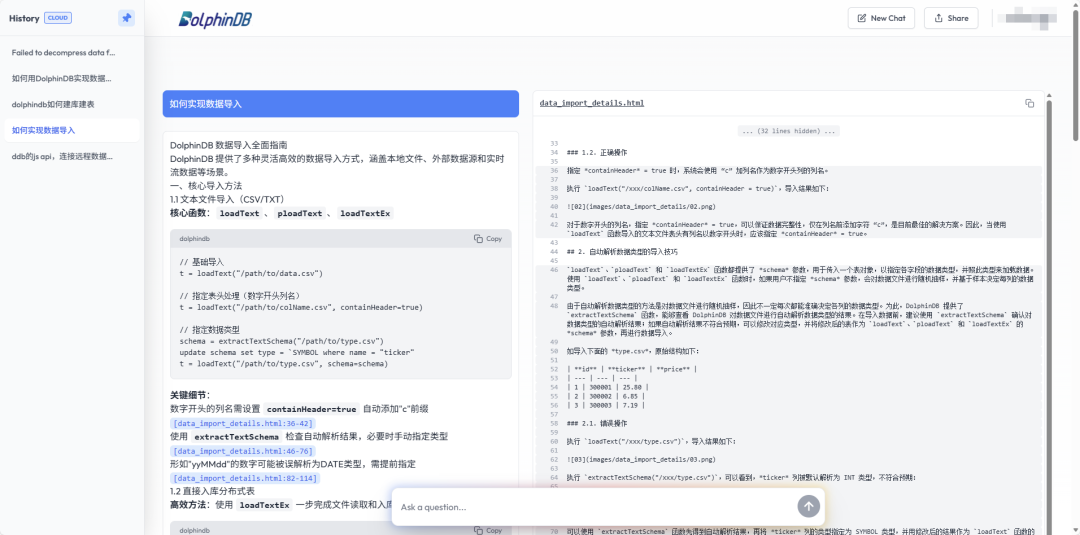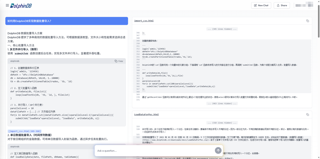 输入“如何用 DolphinDB 实现数据批量导入?”,分步指引+源文档,新手也能搞定。