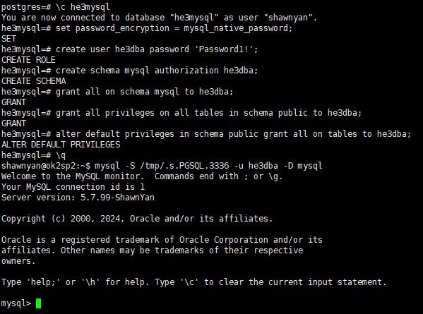 如果要使用 MySQL 客户端连接 he3db 需要创建用户,指令如下。