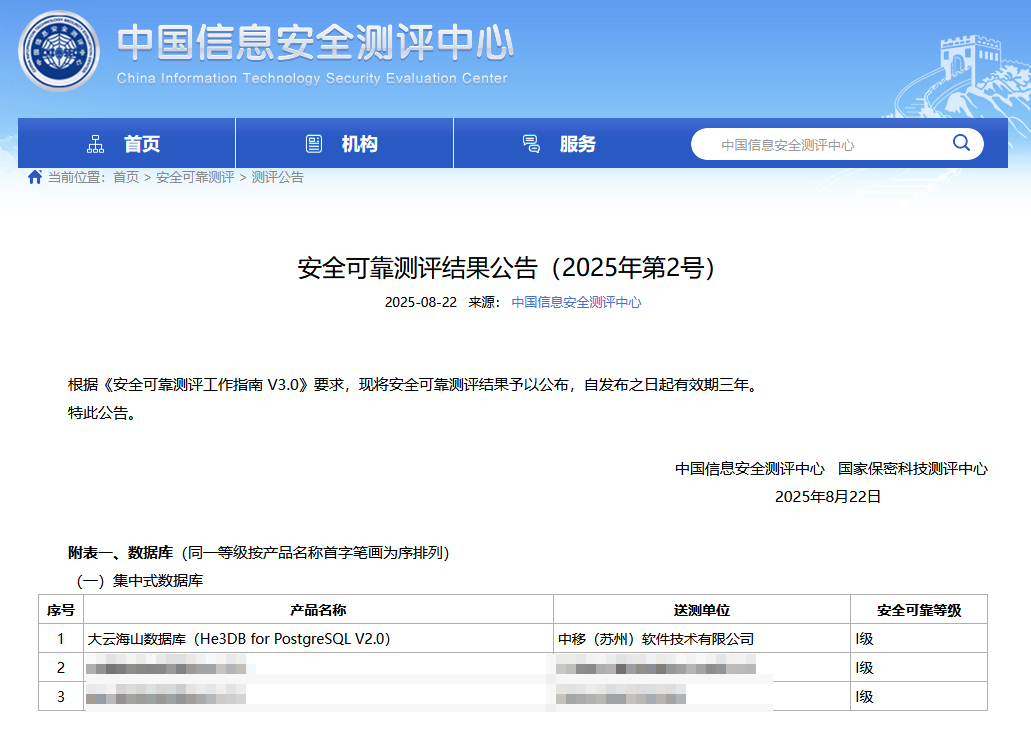 去年 8 月 22 日,新一期的《安全可靠测评》结果公布,“大云海山数据库”位列其中,这是国内电信运营商里,头一个拿下国家级安全可靠认证的数据库。
