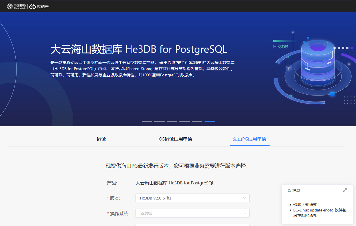 本周二(2.10),大云海山数据库 He3DB for PostgreSQL 在移动云镜像站开放下载试用窗口,填写申请并通过人工审核后,就可以收到下载链接的邮件。
