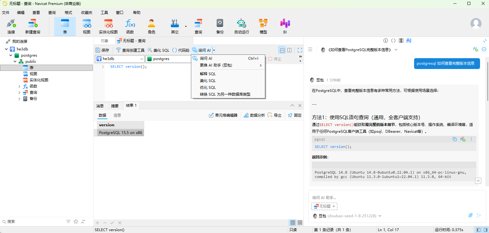 你也可以通过 Navicat 连接到海山数据库,用内置 AI 调用豆包大模型生成你想要查询的 SQL 语句。