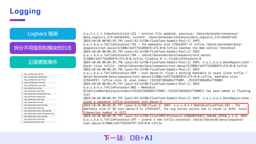 采用 Logback 框架,按模块与日志级别,结合 IoTDB 的 ConfigNode、DataNode 架构对日志进行拆分,同时对 DataNode 日志做进一步细分,如合并日志、慢查询日志等,便于从日志中提取有效信息。