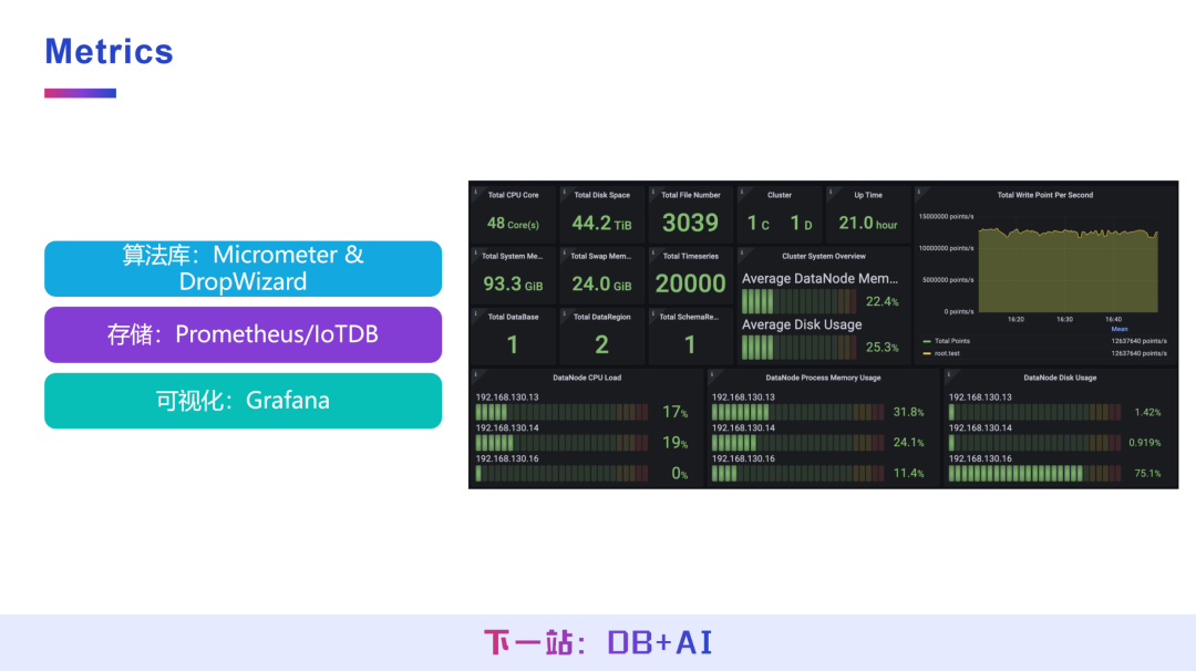 算法库采用 Micrometer 与 DropWizard,存储端可选择 Prometheus 或 IoTDB,可视化层面通过 Grafana 展示所有监控指标,实现对系统运行指标的实时统计与可视化查看。