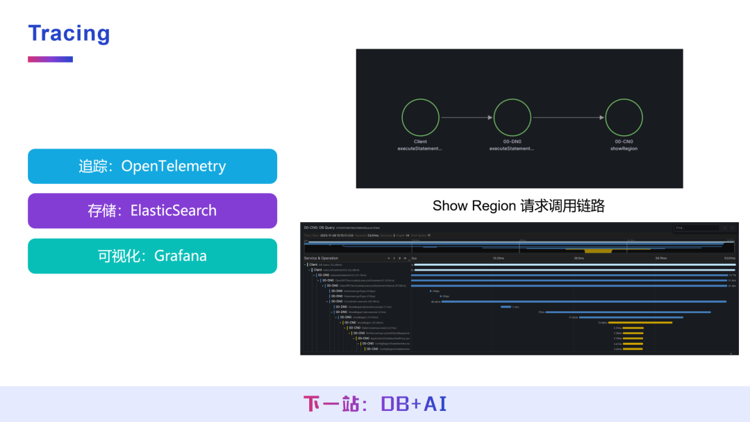 目前处于调研与实验阶段,技术栈采用 OpenTelemetry 实现操作追踪,存储端使用 ElasticSearch,可视化同样基于 Grafana,可实现对数据库操作请求调用链路的追踪与分析。