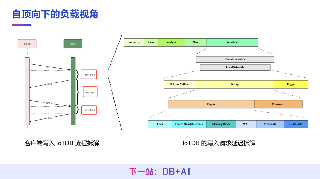 以 IoTDB 写入请求为例,可将执行流程拆解为鉴权、解析、执行计划生成、分布式计划调度、存储引擎处理等多个步骤,通过监控分析每个步骤的耗时、资源占用情况,精准定位负载瓶颈的核心模块。