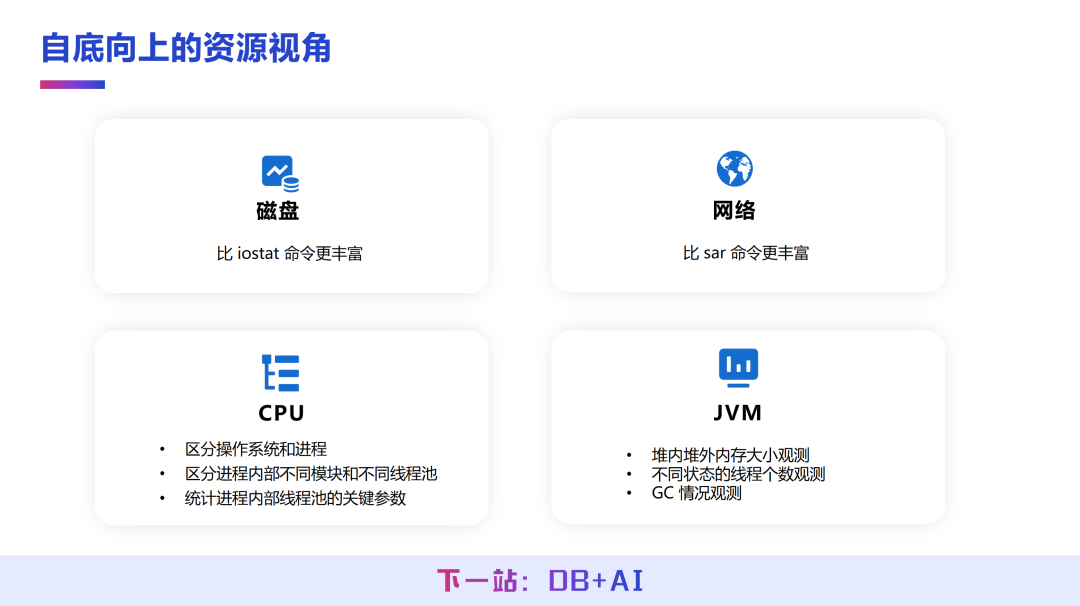 自底向上的资源视角系统服务运行于操作系统之上,将直接影响系统性能的核心资源拆解为磁盘、网络、CPU、JVM 四类,分别分析各资源的负载情况,判断是否成为系统瓶颈:
