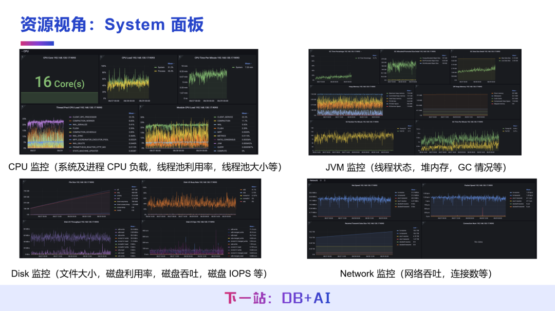 统计数据库运行过程中的聚合类指标,包括写入/查询的平均延迟、CPU 使用率、磁盘与内存的资源走势等,反映系统的整体运行状态。
