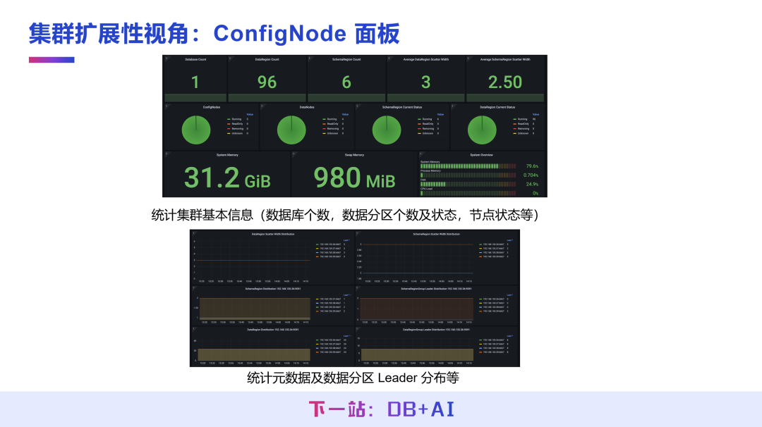 ConfigNode 作为 IoTDB 集群的管理者,该面板主要统计集群的基础配置信息,包括数据库个数、数据分区个数及状态、节点运行状态等,同时展示元数据分区与分区 Leader 的分布情况,直观反映集群的配置与分区管理状态。