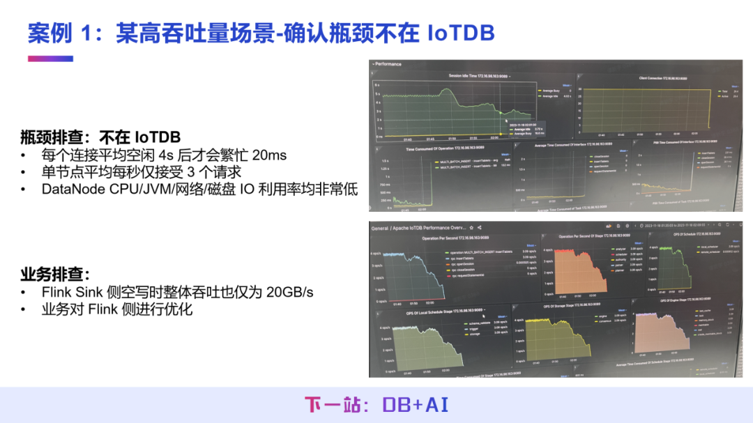 业务侧基于该结论验证,将 Flink 写入 IoTDB 的链路断开后,Flink 空跑的整体吞吐仅为 20 GB/秒,确认瓶颈点在 Flink 客户端侧。