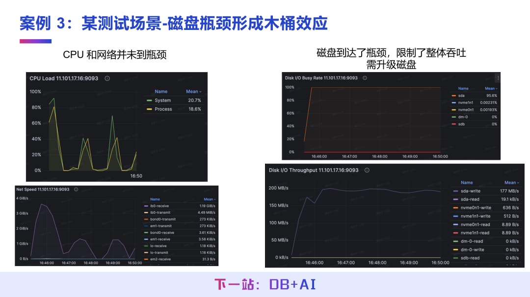进一步监控磁盘性能,发现 A 基地磁盘一次 I/O 耗时约 10 毫秒,B 基地仅为 1 毫秒,二者磁盘性能相差数倍,是查询性能差异的核心原因。