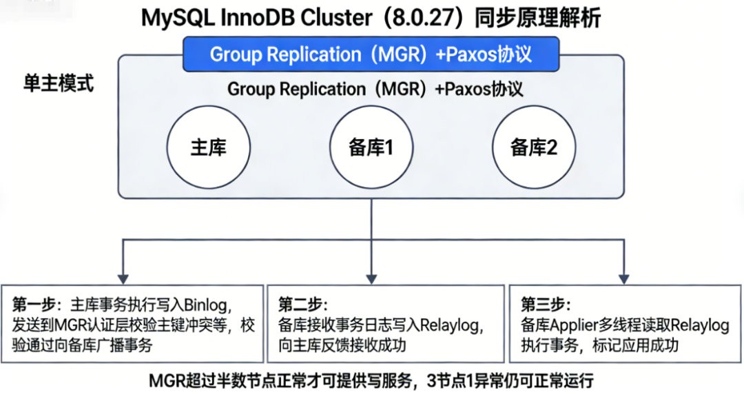 InnoDB Cluster的高可用和数据同步,完全依赖MGR实现,单主模式下(本次集群模式),同步流程分为3步,核心遵循Paxos协议(保证集群节点数据一致性):
