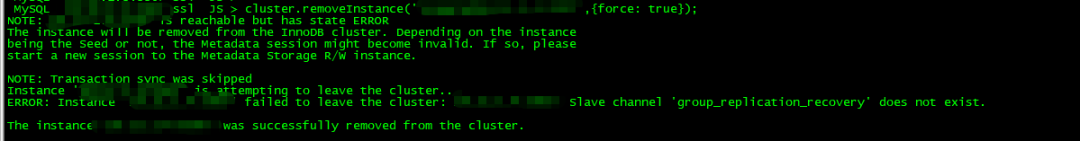 +---------------------------+--------------------------------------+-------------+-------------+--------------+-------------+----------------+----------------------------+正常情况下,会显示3个节点,且MEMBER_STATE均为ONLINE;此处仅显示异常节点,且状态为ERROR,说明节点已退出集群。