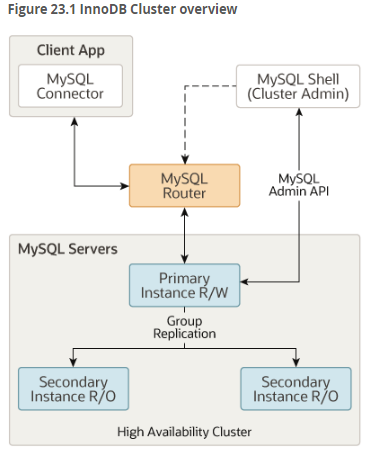 本次故障中,备库Applier线程因死锁无法应用事务,导致“同步流程第三步中断”;MGR为保护集群一致性,直接将该节点踢出集群——本质是“同步流程中断→集群一致性受到威胁→节点被剔除”的保护机制。如下是innodb cluster官方架构图。