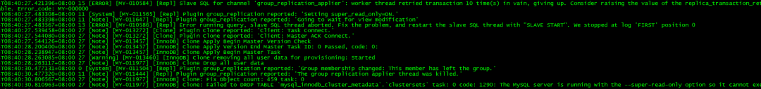 :异常节点因初始故障,仍处于super-read-only = ON模式(MGR自动设置),无法执行DROP TABLE等写操作,导致Clone插件清理数据失败,克隆任务报错(Error 1290),节点无法重新加入集群。