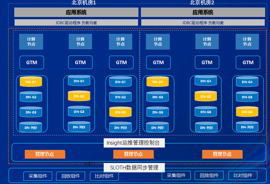 - 交易型计算节点和分析型计算节点由GoldenDB管理节点进行统一管理,双引擎分别对应各自行存和列存存储引擎;