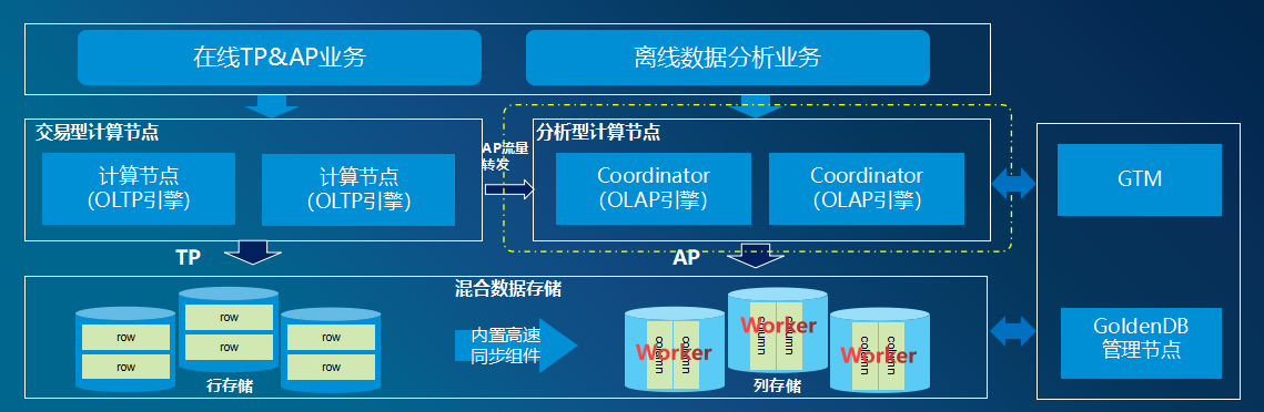 GoldenDB HTAP架构(1.0版本)在计算层分交易型(TP)计算节点和分析型(AP)计算节点,在存储层分为行存存储引擎和列存存储引擎,其中: