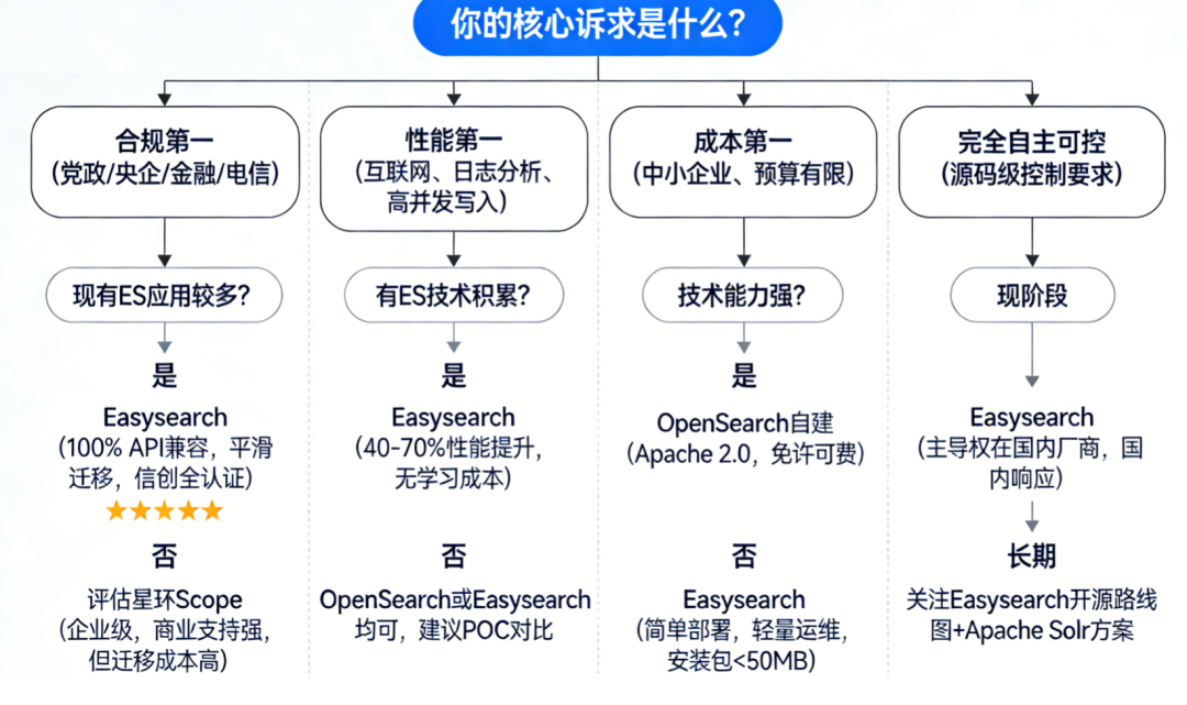 100% ES API 兼容——这让迁移成本趋近于零,技术团队不需要重学 全系信创 CPU/OS 认证——这是招标合规的硬门槛,非一日之功 国内商业支持体系——在敏感项目中,"本土厂商"的响应速度和责任担当不可替代