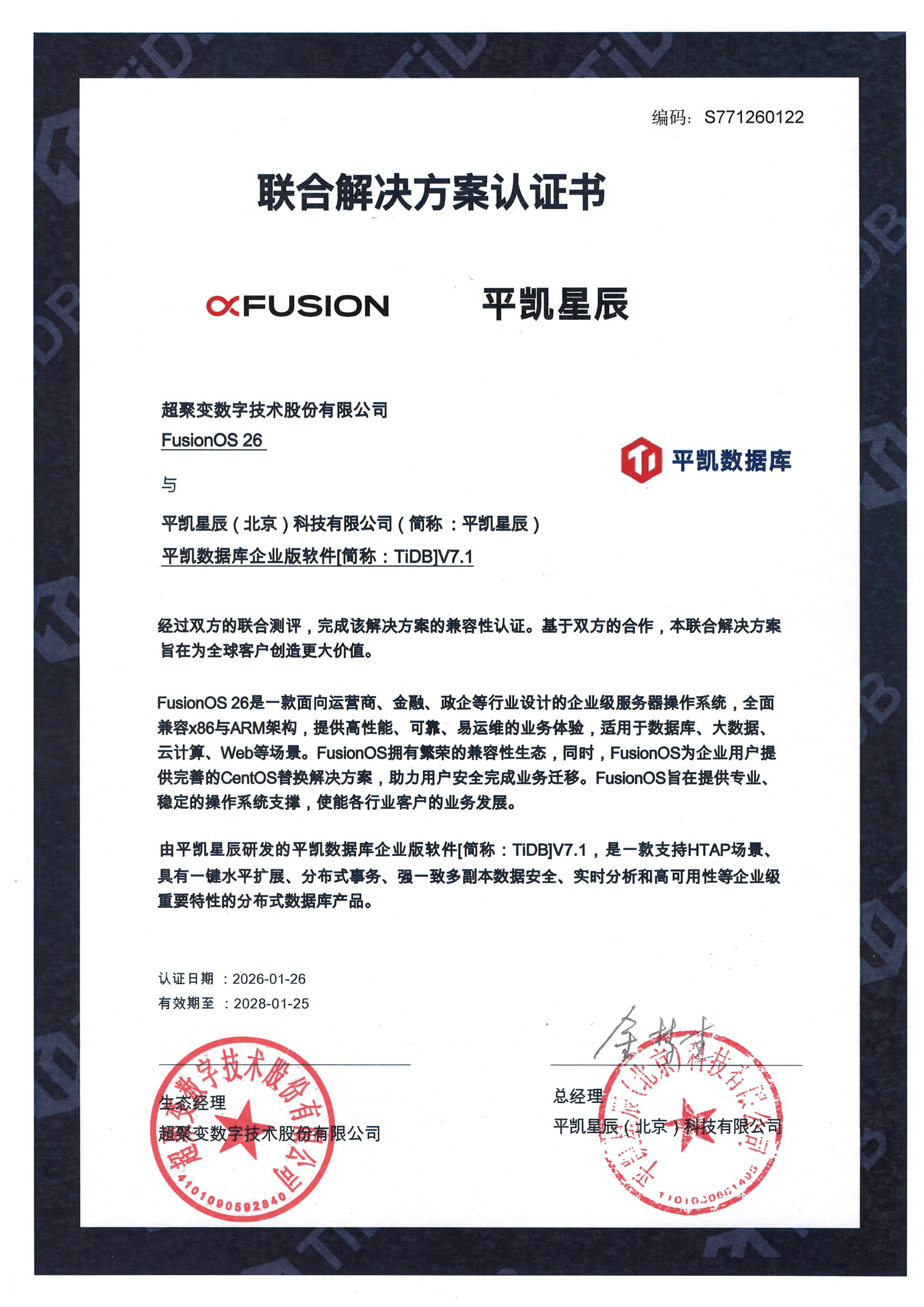 平凯星辰相关负责人指出:“FusionOS 26 在关键行业的广泛应用与生态影响力,与 TiDB 的企业级数据底座能力形成强大协同。此次认证是 TiDB 在基础设施领域的重要突破,期待双方以此次合作为契机,共同推动企业级系统的国产化替代与架构优化,更欢迎更多伙伴加入生态,让技术创新赋能各行业高质量发展。”