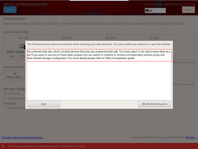 在安装系统时,如果之前的系统选择多块磁盘组成逻辑卷进行安装,再次安装时,如果只选择了其中的一块或几块磁盘,没有全部选择,在保存配置时提示配置错误,如图1所示。