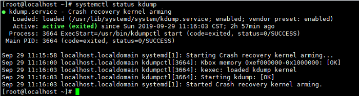 systemctl status kdump若回显如下,即kdump的状态为active,说明kdump已使能,操作结束。