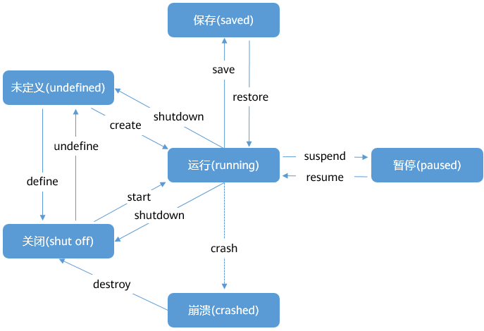 - 关闭状态(shut off):虚拟机已经被定义但未运行,或者虚拟机被终止。