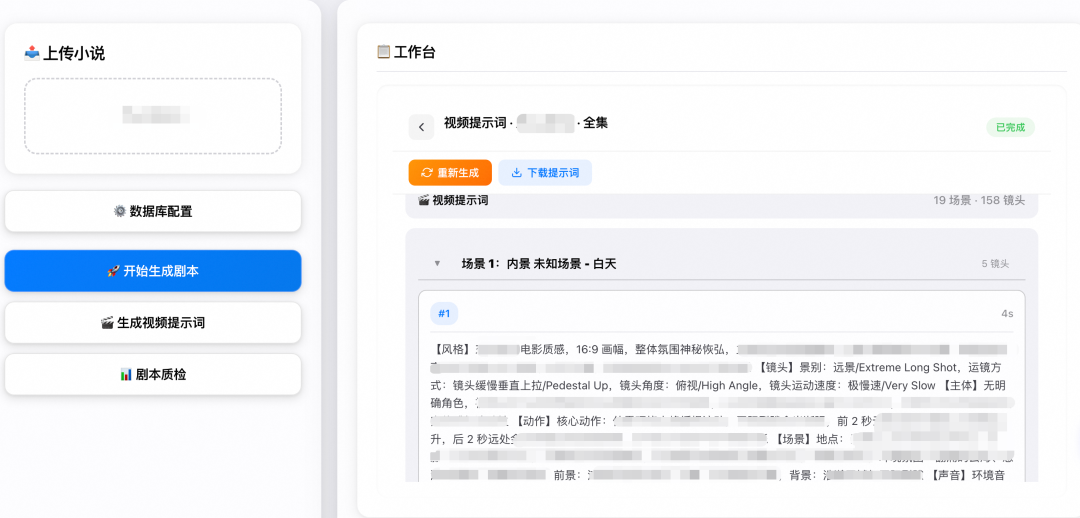 专业术语转换:将剧本中的动作描述转化为标准的电影拍摄术语,如特写、拉镜头、俯瞰视角等; 视觉一致性控制:基于场景描述生成详细的光影效果、材质纹理、色调风格等视觉指导; 标准化输出:生成适配各种多模态大模型的标准Prompt格式。