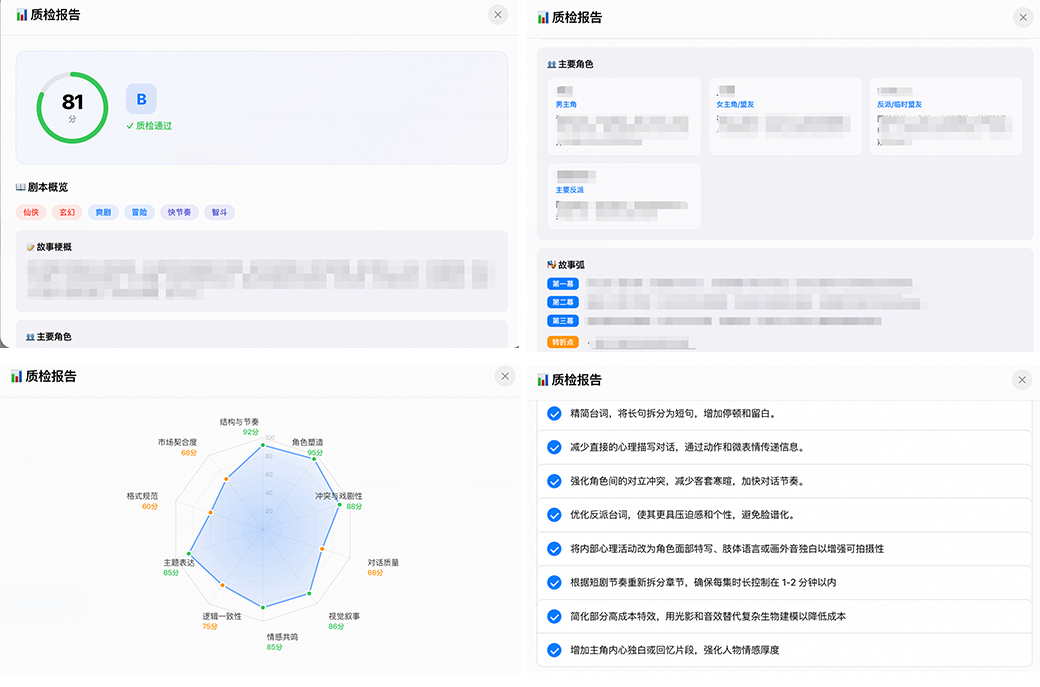多维度评分系统:从结构完整性、内容一致性、原著还原度、节奏控制等多个维度进行自动化评分; 智能迭代引擎:识别评分低于设定阈值的问题环节,生成具体的修改建议,并触发相关Agent进行重写优化。