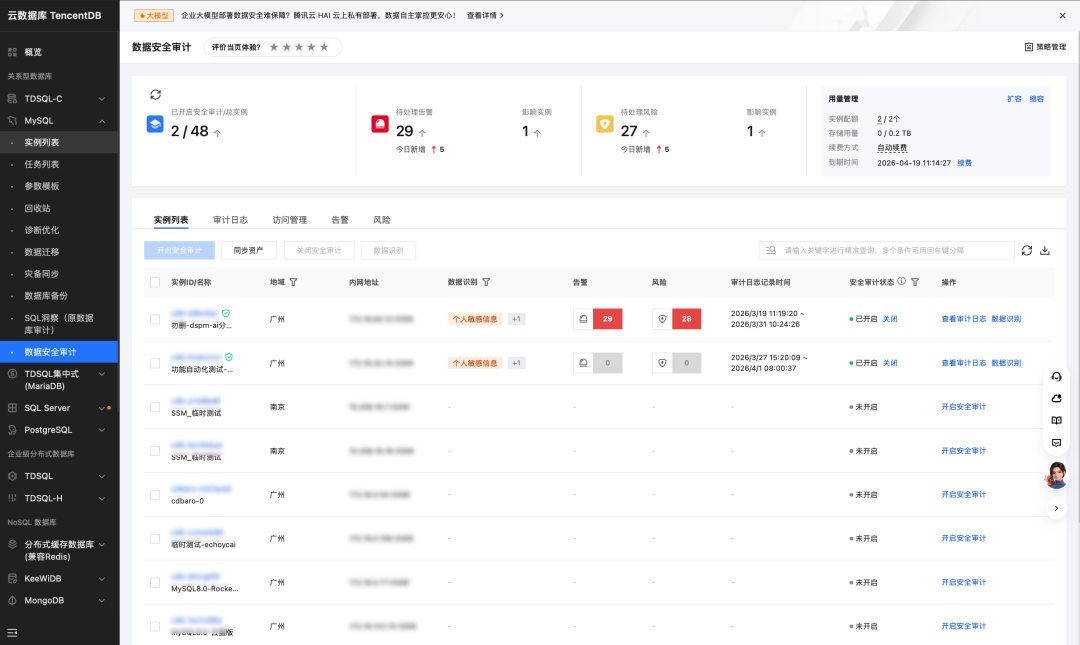 控制管理面统一:云数据库控制台内嵌数据安全审计模块,通过统一 UI 和交互,让安全指标像 CPU/内存 利用率一样,成为数据库基础属性。