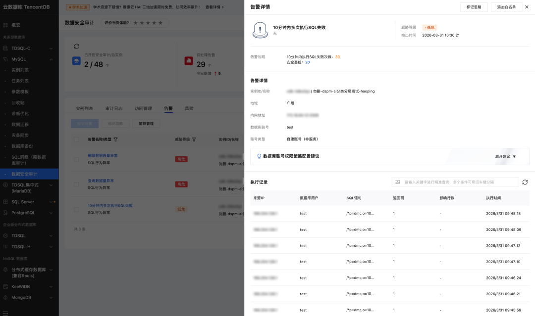 安全无忧:基于行为基线与实时预警机制,构建云数据库内生安全防护屏障,显著降低核心资产在动态访问环境下的数据泄露风险。