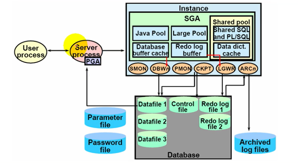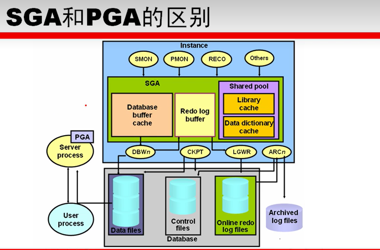 数据库启动时创建的实例(进程 + 内存结构集合),包含 1 个 SGA(系统全局区,如共享池、缓冲区高速缓存)和多个 PGA(程序全局区);一个服务器进程(专用 / 共享)启动时会分配 1 个独立 PGA(后台进程无独立 PGA),且无论启动多少进程,1 个实例始终只存在 1 个 SGA。
