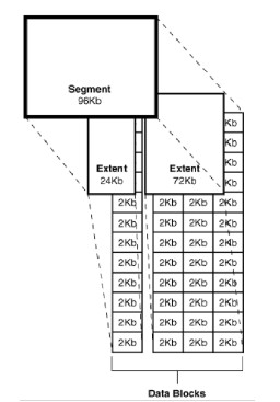 - 特点:数据量增长时,会自动申请新区扩展段的大小。