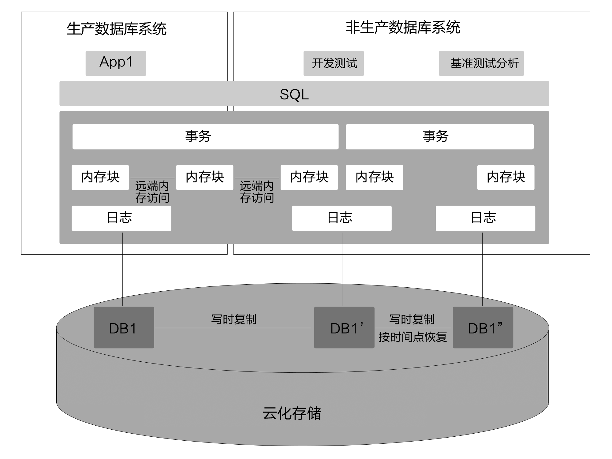 由于云数据库系统实现多个数据库系统之间数据的共享(即在一个存储池中,存储大量的数据库)。因此,可以实现对这些数据库高效的复制、克隆、回合等功能。比如,某公司可能需要基于现有数据库系统的当前数据,开发一个新的应用。传统的做法是,为了测试应开发的应用不影响到现有的线上应用,公司通常会构建一个新的数据库系统,并从当前线上系统导出一份最新的数据,并将这份新的数据导入到另外一个数据库系统中(比如刚创建的数据库系统实例),并在该数据库系统开发、测试新的应用。