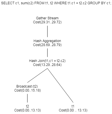 (2)由于连接条件(t1.c1 = t2.c2)中的列与两表的分布列不同,因此该计划对t2进行了广播(Broadcast),广播算子的总代价为15.18,此代价已经包括了顺序扫描t2的代价13.13。