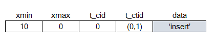假设我们在一个Xid为10的事务中,在一个只有一列varchar(变长字符串(类型))数据的表中插入一条数据’A’,该行数据落入编号为0的数据页面上,则该行结构如图9-5所示。
