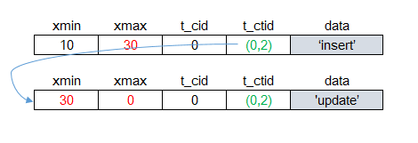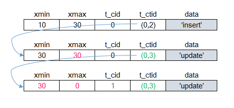如果我们在之前insert的基础上,在事务xid=30中连续对该行做两次更新,则改行记录则会如下所示: