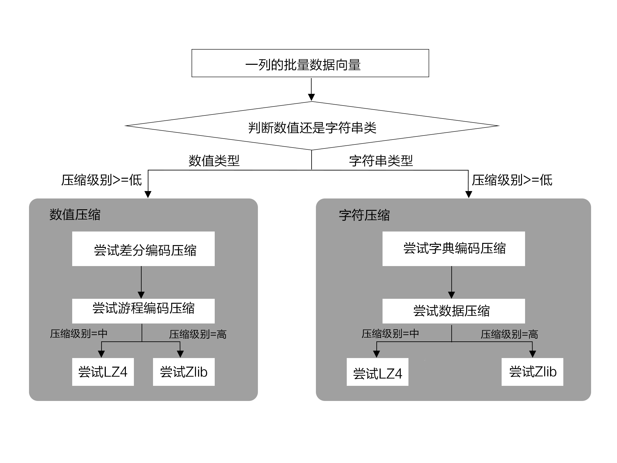 每次数据导入,首先对每个列数据按照向量组装,对前几批数据做采样压缩,根据数值类型和字符串类型,会选择尝试不同的压缩算法。一旦采样压缩完成后,接下来的数据就选择优选的压缩算法了。如图9-36所示,主要分数值压缩和字符压缩。其中对Numeric小数类型,会转换为整数后,再按照数值压缩。对数值型字符串,也会尝试转换为整数再按照数值压缩。