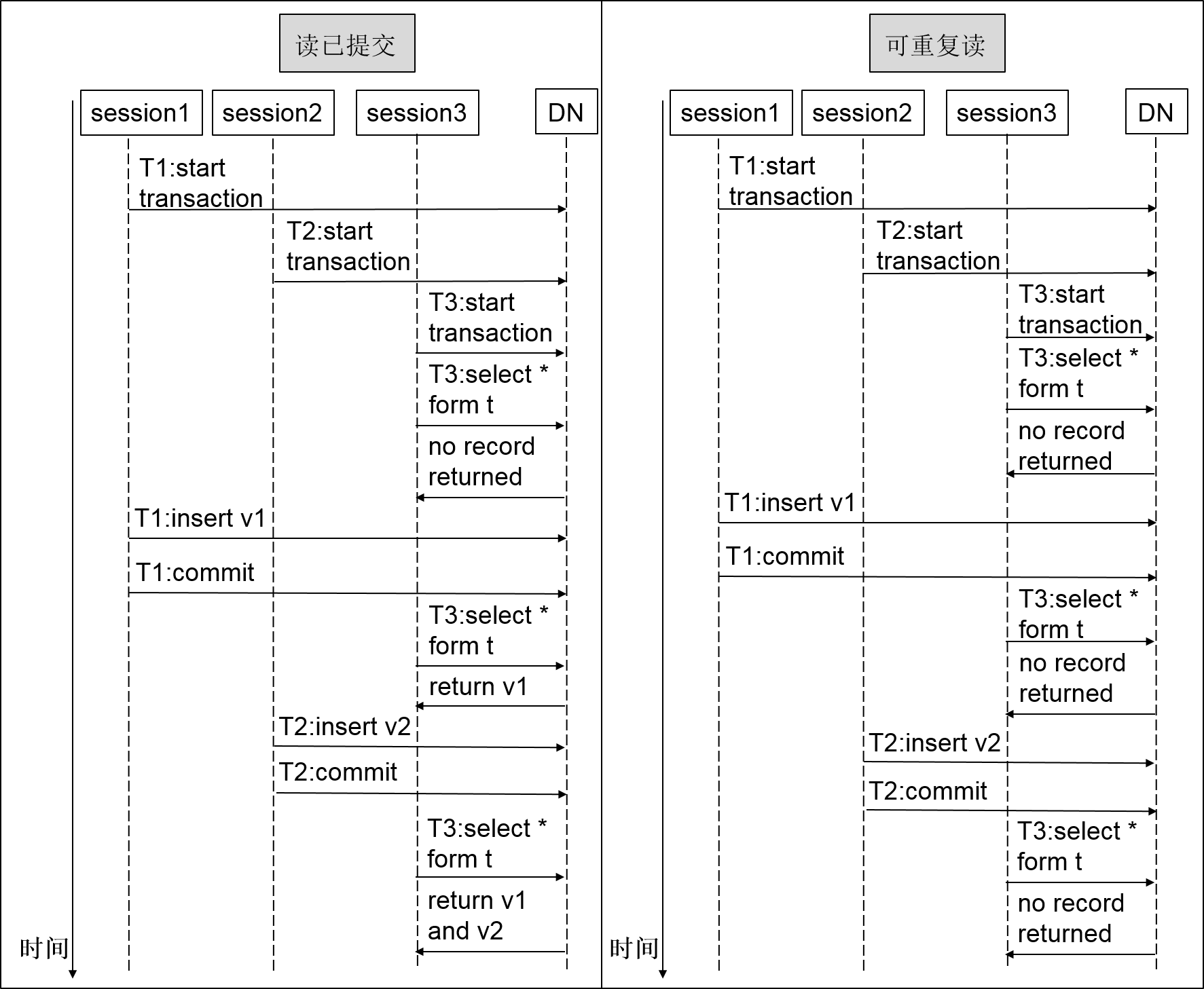 另一方面,如果采用可重复读的隔离级别,对于T3中的三条查询语句,均会采用第一条语句执行开始时的快照,而T1和T2均在该快照中,因此在该隔离级别下,T3的三条查询语句均不会返回v1和v2。