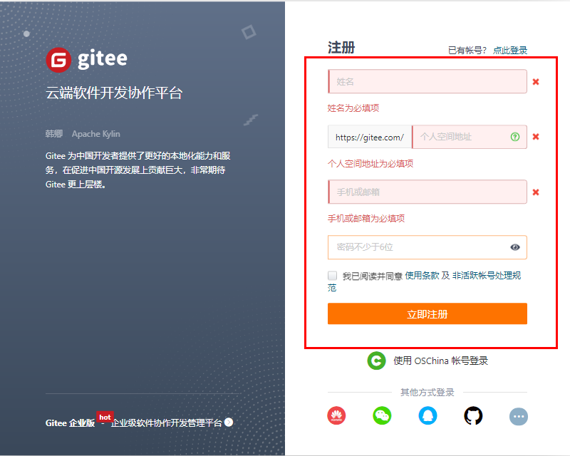 (2) 在注册页面填写相关信息并勾选阅读和同意相关条款,完成码云注册。如图2-13所示。
