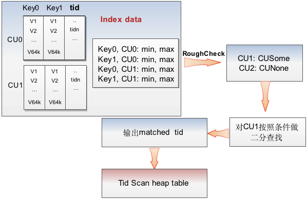 查询时如果使用psort索引扫描,会首先扫描psort索引cstore表(扫描方式和上面cstore表扫描流程相同)。在一个psort索引CU的内部,由于做了局部聚簇索引,因此可以使用基于索引键的二分查找方式,快速找到符合索引条件的记录在该psort索引中的行号,该行的TID字段值即为该条记录在cstore主表中的行号。上述流程如图4-29所示。值得一提的是由于做了局部聚簇索引,因此在索引cstore表扫描过程中,在真正加载索引表CU文件之前,可以通过CUDESC中的min max做到非常高效的初筛过滤。