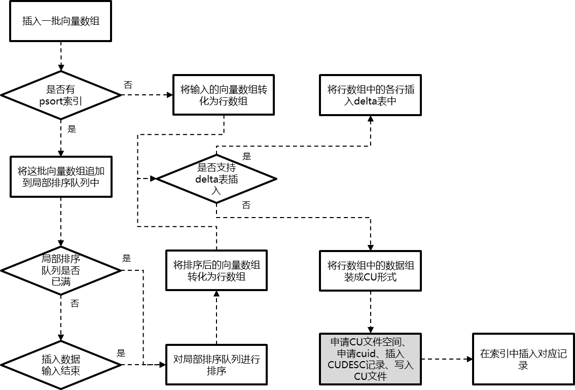 cstore表插入执行流程,可以参考图4-27所示。其中灰色部分内的具体流程可以参考图4-24、图4-25中所示。当满足以下3个条件时,可以支持delta表插入: