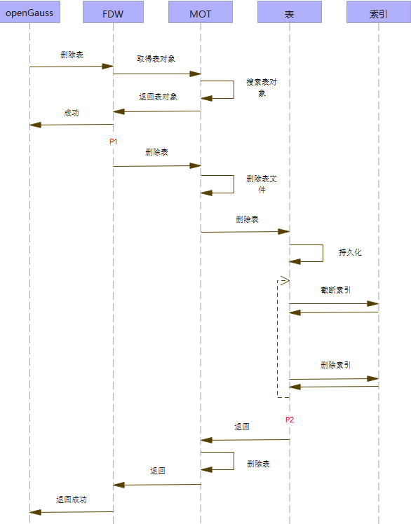 正常事件流:FDW从MOT引擎中检索表对象,并将DELETE表的请求转发给MOT引擎。DDL命令在重做日志中持久化,然后对于表中的每个索引,索引数据将被截断并DELETE索引对象。随后对表中的每个索引重复此过程。在DELETE所有索引对象之后,MOT将DELETE表对象并返回给FDW。