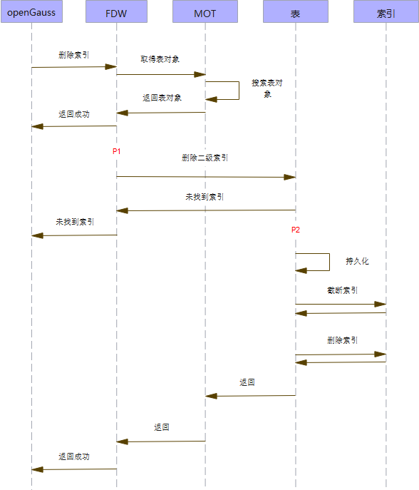 如图4-47所示,用户希望DELETE内存表中的现有索引时,openGauss通过FDW适配器将请求转发给MOT存储引擎。