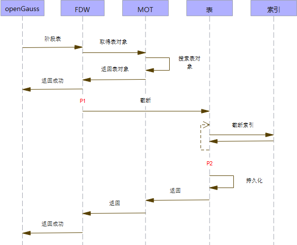 如图4-48所示,用户截断现有的内存表内容时,openGauss通过FDW适配器将请求转发给MOT存储引擎。