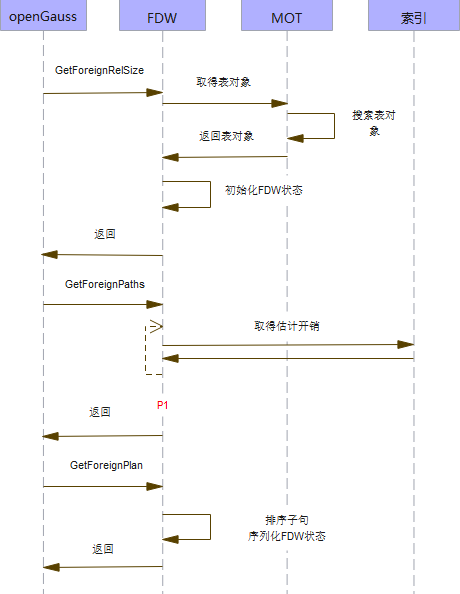 正常事件流:openGauss调用GetForeignRelSize接口,FDW从MOT中检索相关表对象,并用启动成本和总成本估计初始化此查询的FDW状态。openGauss调用GetForeignPaths触发所有涉及索引对象的开销计算。最后,openGauss调用GetForeignPlan触发结束整个过程,包括查询子句对本地和远程排序,以及根据所选执行路径对FDW状态进行序列化。PREPARE语句的执行在此结束,其他语句待执行的部分将在执行阶段中描述。