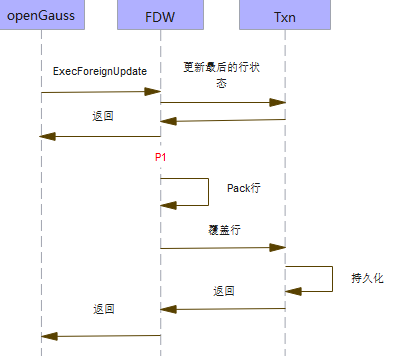 正常事件流:openGauss为特定更新的元组调用ExecForeignDelete接口。FDW更新当前事务对象中最后一行的状态以进行并发控制,然后将操作持久化到重做日志中,并返回openGauss。