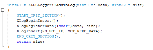 | XLOGLogger | 基于openGauss XLOG (WAL)的ILogger的一个实现,它简单地使用openGauss WAL接口将序列化的事务写入WAL中。MOT WAL日志项有自己的资源管理器,这可以使openGauss识别到该日志项是一个MOT WAL日志项,并将其转发到MOT处理。AddToLog为XLOGLogger子接口,XLOGLogger使用openGauss日志基础能力。因此,AddToLog是一个对openGauss XLOG接口的简单委托 |