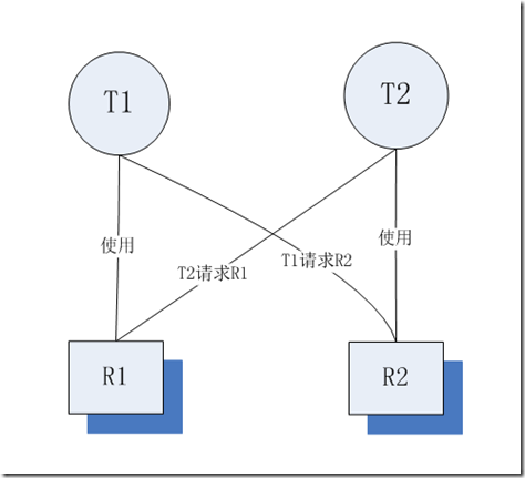 死锁主要是由于进程B要访问进程A所在的资源,而进程A又由于种种原因不释放掉其锁占用的资源,从而数据库就会一直处于阻塞状态。如图5-17中,T1使用资源R1去请求R2,而T2事务持有R2的资源去申请R1。